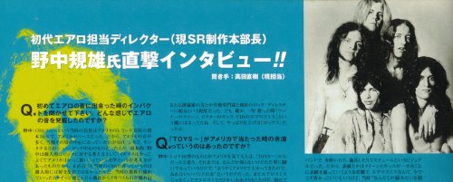 | 野中 | トップ40型のものとかアメリカを見てる人は『TOYS〜』からだったと思う。それまで、なんだか知らないけどただ単に騒いでるってだけで、「アメリカであがってきたので、あれはいいバンドだな」というだけだった。まだエアロスミスじゃなくて、アエロスミスだとかいわれもしたけれど、初めてアメリカン・ヒット・チャート系番組とか雑誌とかでも一応紹介はされた。でも爆発はしなかったな。 |